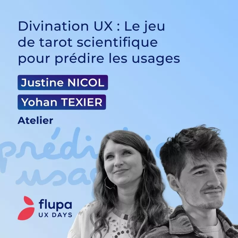Justine, UX Researcher, et Yohan, designer UX/UI, animeront un atelier aux flupa UX Days pour présenter Divination UX : le jeu de cartes qui prédit les usages de votre service/produit.