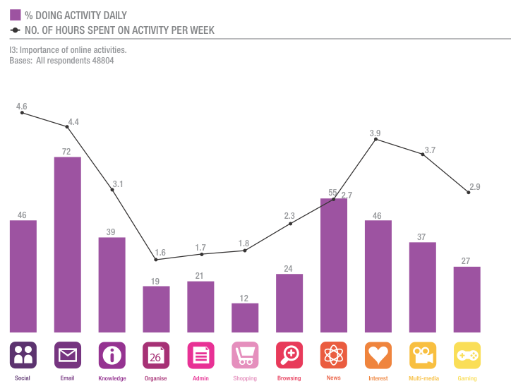 D’après TNS Digital Life, les réseaux sociaux ne sont qu’au troisième rang en termes d’utilisation quotidienne (46%), après le mail (72%) et les actualités (55%). Mais lorsqu’on regarde ces habitudes en termes de temps passé, les réseaux sociaux occupent la première marche du podium !