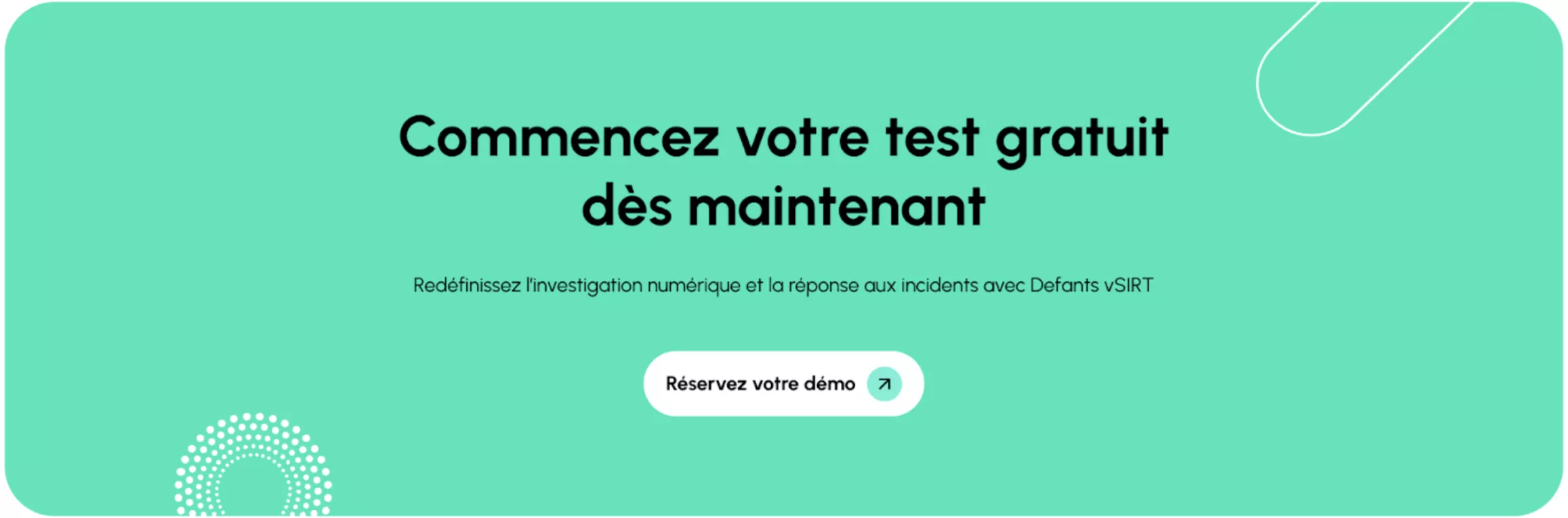 Enfin, au sein de toutes les pages ont été placés des encarts dédiés à la conversion. C’est ce que l’on appelle des assets marketing. Soit ceux-ci proposent un appel avec un expert, soit ils incitent à demander une démonstration de la solution. Érika a alors misé sur la couleur vert flash de la charte graphique de Defants pour créer des encarts qui captent l’attention des utilisateurs.