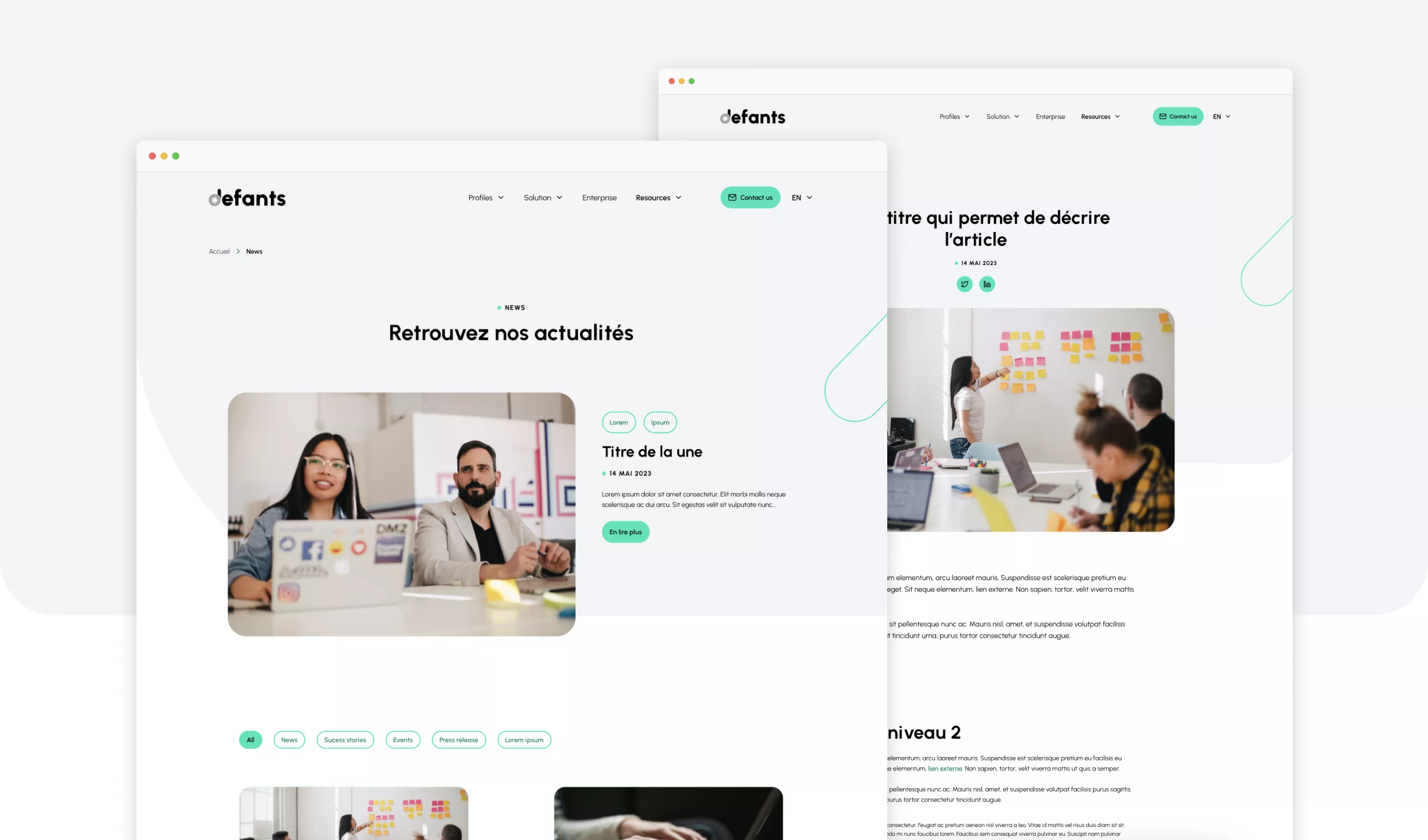Gauthier, en front-end, et Aimerick, en back-end, ont donc développé le tout nouveau site de Defants. L’ajout d’une partie “Ressources” a nécessité de proposer un back-office compréhensible et administrable facilement par les clients. En effet, ils seront autonomes sur la gestion de leurs actualités.
