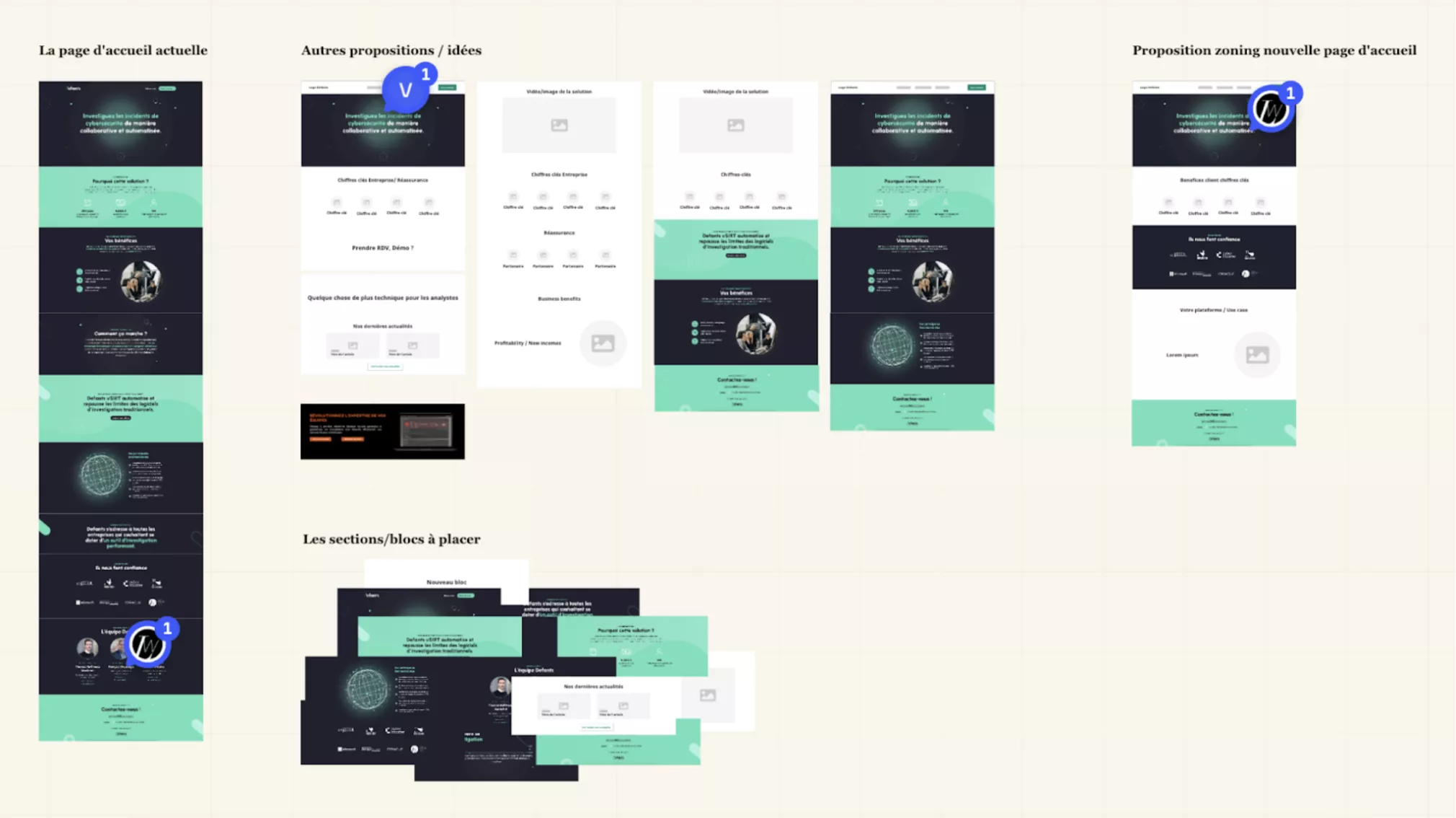 Une fois toutes les pages et blocs définis, nous avons pu s’accorder sur le zoning des pages, notamment celle de l’accueil, au travers d’un atelier zoning studio. Pour ce faire, nous nous sommes basés sur la page d’accueil existante pour co-concevoir le zoning de celle de demain. Un tel atelier permet à chaque partie prenante de transmettre toutes les informations et d’exprimer ses intentions sous la forme d’un brainstorming visuel. L’aboutissement à un consensus a permis de concevoir une piste de qualité pour pouvoir ensuite maquetter la page.