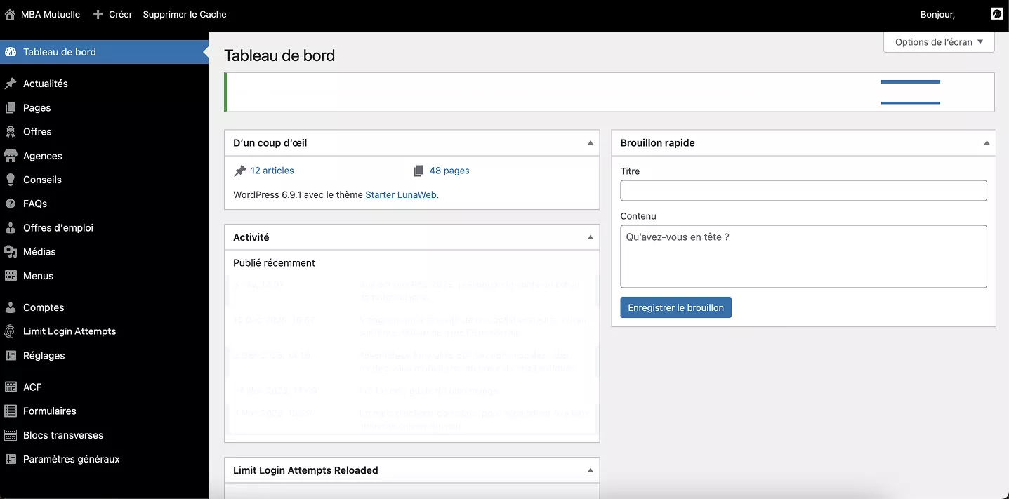 L’un des gros enjeux de cette refonte était l’administration de contenus. L’ancien site de MBA Mutuelle avait été développé sous un CMS propriétaire, et avec les années et le grand nombre de contenus et formulaires de contact, l’administration des contenus était devenue très complexe. L’équipe clients attendait donc de nous de leur fournir un back-office épuré, productif, avec une prise en main simple, offrant à la fois de la souplesse et de la structure (pour respecter l’arborescence et les maquettes graphiques).