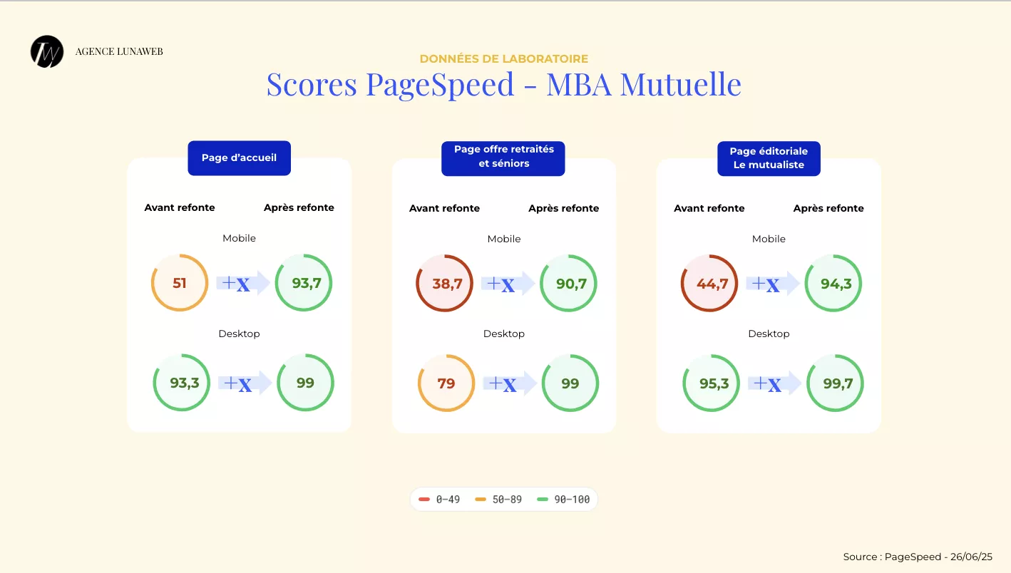 - le score PageSpeed Insights est passé de 51/100 à 93/100 sur mobile pour la page d’accueil, soit un gain de 42 points,