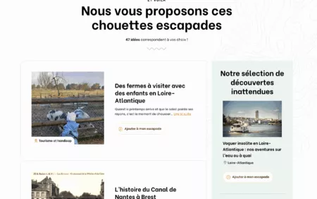 Un autre objectif du site Internet était de valoriser la diversité des sorties possibles en Loire-Atlantique : il y a plein de choses à voir au-delà de Nantes ou de la Côte Atlantique. Au même titre qu’il existe de nombreux lieux méconnus qui valent le détour : ils ont été répertoriés dans la catégorie “Nos inattendus”. Les recommandations s’adaptent aussi à la saison à laquelle vous souhaitez venir. Ce territoire est riche et attractif toute l’année, il était important de le rappeler. Cela incite à davantage répartir les flux touristiques sur les 12 mois de l’année.