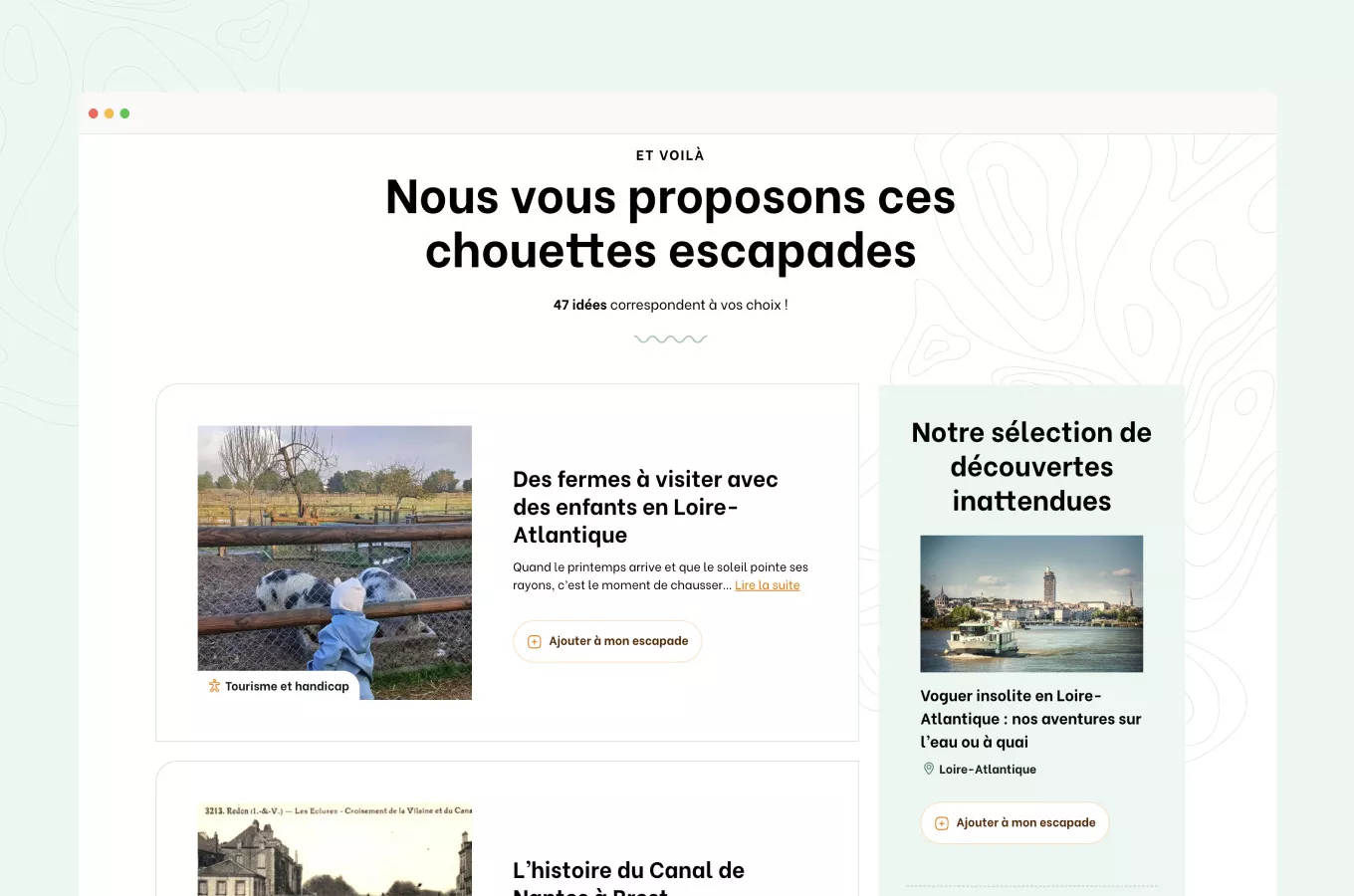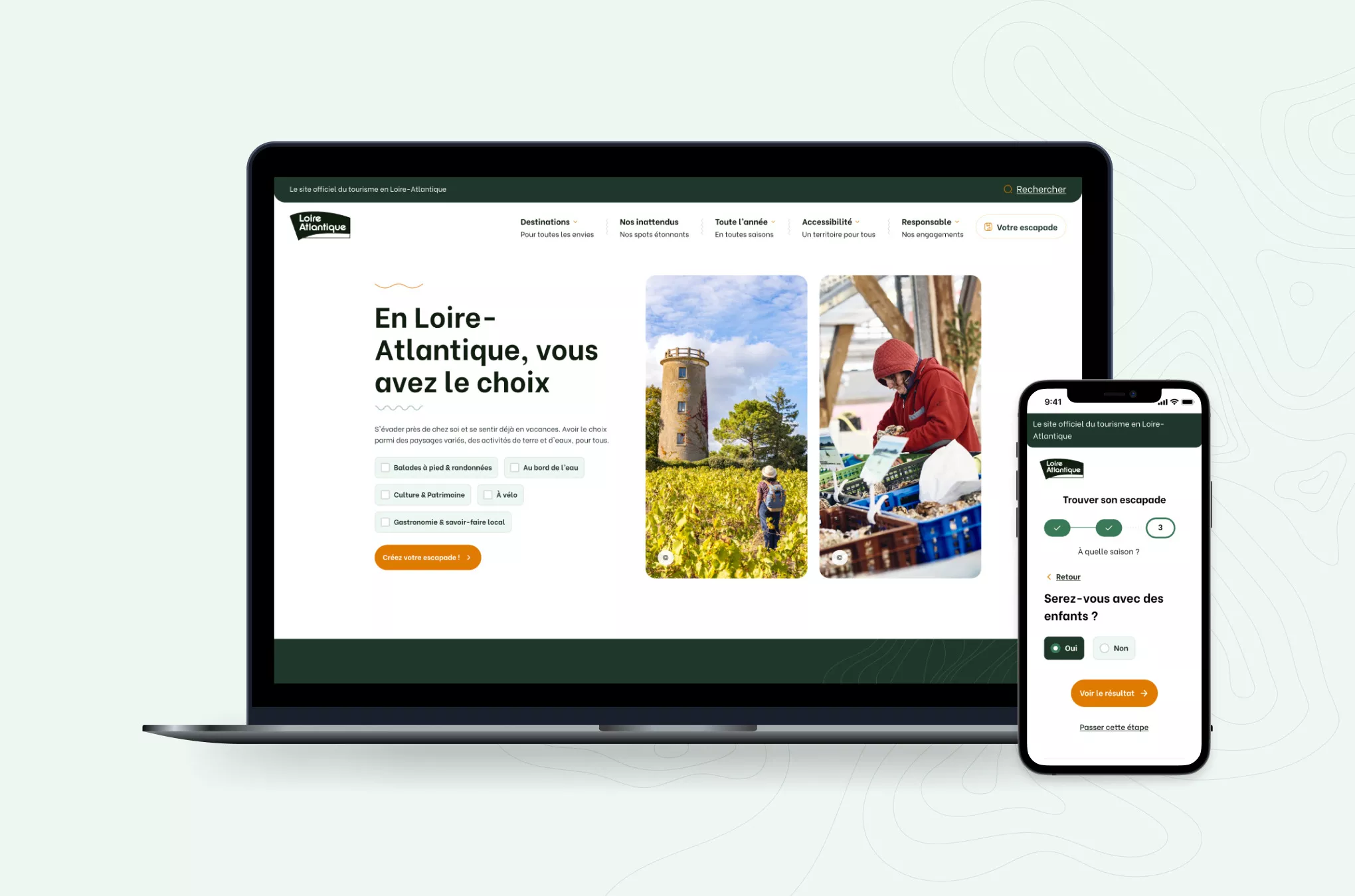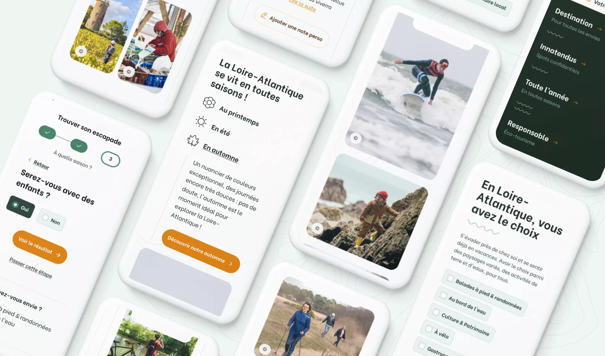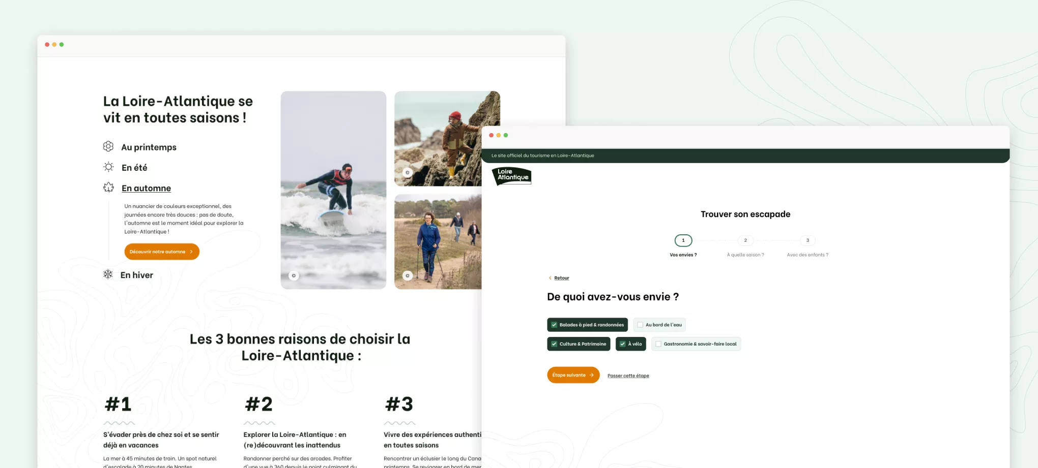 Le site de Loire-Atlantique Tourisme devait être un site catalogue, proposant des visites selon les saisons ou des thèmes, par exemple. C’est un format assez classique mais dans le but de le démarquer, nous avons souhaité pousser cette approche dès l’entrée sur le site. Pour en faire un guide inspirationnel, nous avons imaginé un formulaire en trois étapes pour recommander des escapades en fonction du profil et des envies de la personne répondante. La première étape de ce filtrage se réalise depuis le hero, où il est possible de cocher différents types d’activité : “promenades à pied”, “au bord de l’eau”, “à vélo”, “culture et patrimoine” et “gastronomie et savoir-faire local”.