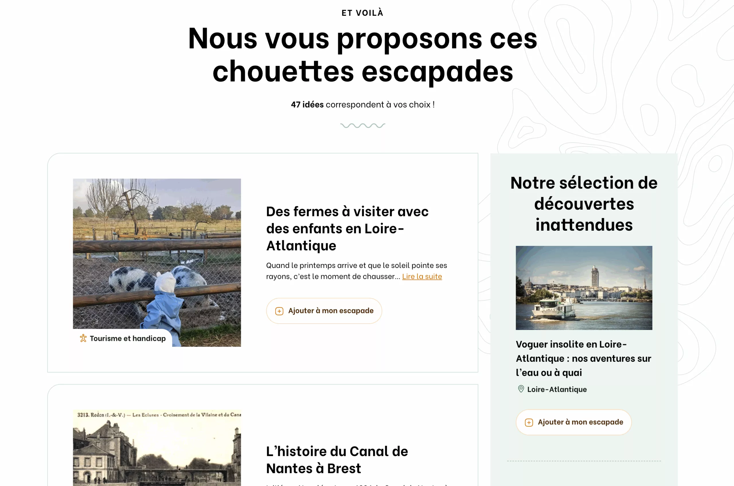 Le fait de ne proposer que trois étapes de filtrage permet de montrer un large panel de propositions et de conserver l’intérêt de l’utilisateur. Une fois les étapes validées, une page de résultats s’affiche. Le parcours ne s’arrête pas là : les activités proposées sont cliquables pour en savoir plus.