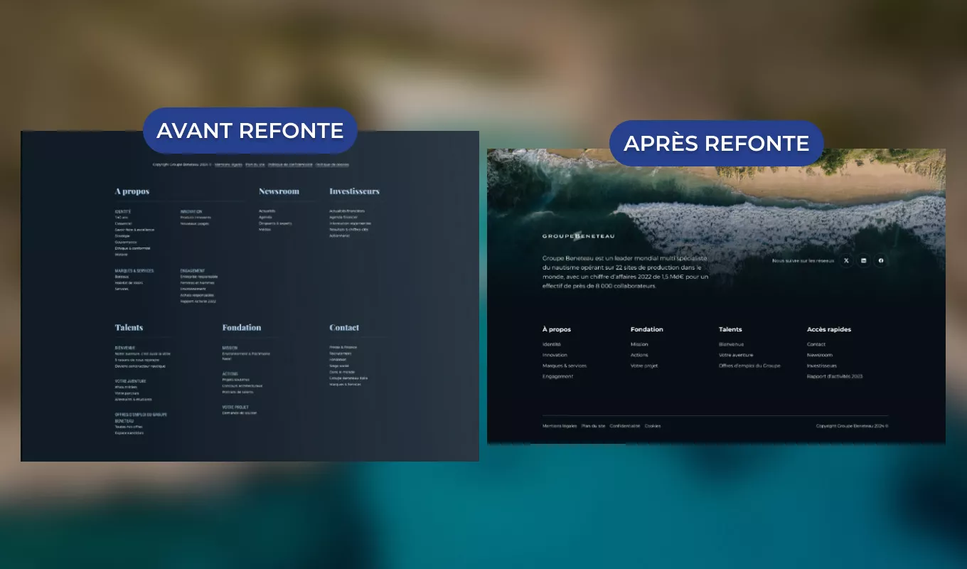 Le menu de navigation secondaire, le footer, a lui aussi quelques ajustements, pour coller aux objectifs SEO et proposer une vue clarifiée sur les contenus du site.
